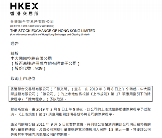 联交所宣布,由2019年3月8日上午9时起,该公司的上市地位将根据除牌程序予以取消。“上市规则”第17项应用指引订明长期停牌公司的除牌程序。该公司的股份自2011年9月5日起暂停买卖,待刊发公告厘清有关该公司现已被停职的执行董事徐连国,及该公司前执行董事徐连宽涉嫌挪用人民币1.5亿元一事。其后该公司失去其对中国内地附属公司的控制权。