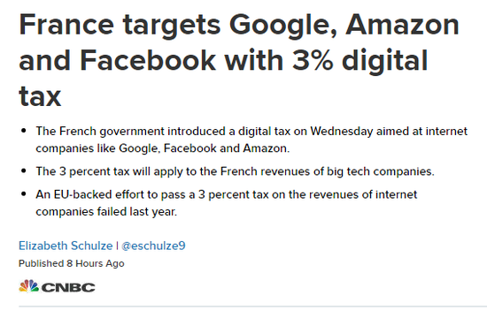 法国政府周三出台了一项数字税,旨在向谷歌、亚马逊和Facebook等大型科技公司征税,以实现财政公平。