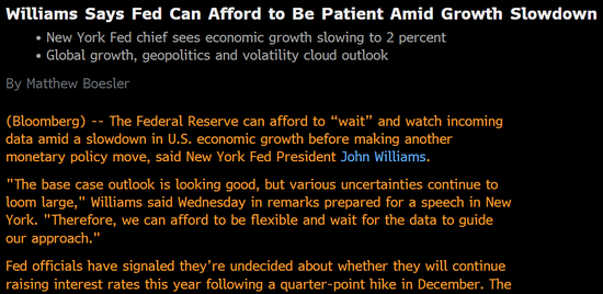 纽约联邦储备银行行长John Williams表示,在美国经济增长放缓之际,美联储可以“等待”并观察经济数据,然后再采取下一步货币政策行动。