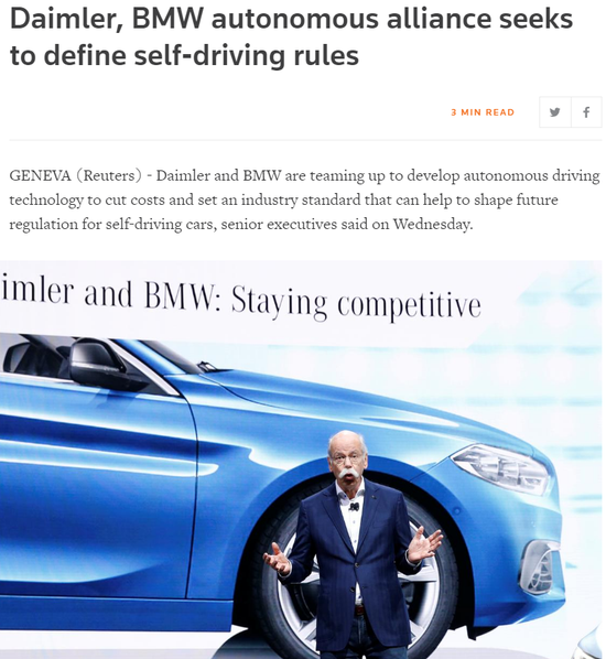 高管们在日内瓦的一场新闻发布会上解释称,自动驾驶汽车的研发成本不断上升,迫使宝马和戴姆勒联手分担财务和工程负担。