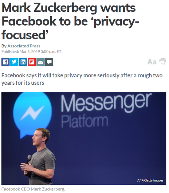 Facebook首席执行官马克-扎克伯格(Mark Zuckerberg)周三发布了一份3000字的备忘录,概述了这家科技公司更加“关注隐私”的未来,称保护隐私的通信平台将“变得比今天的开放平台更加重要”。过去一年,Facebook一直受到隐私丑闻的困扰,并受到用户和立法者的强烈批评。