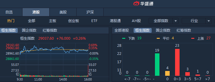 周三恒生指数宽幅震荡,收涨0.26%报29037.6点,全日成交额达1145.15亿。国企指数涨0.08%,报00592.03点,红筹指数涨0.17%,报4553.72点。