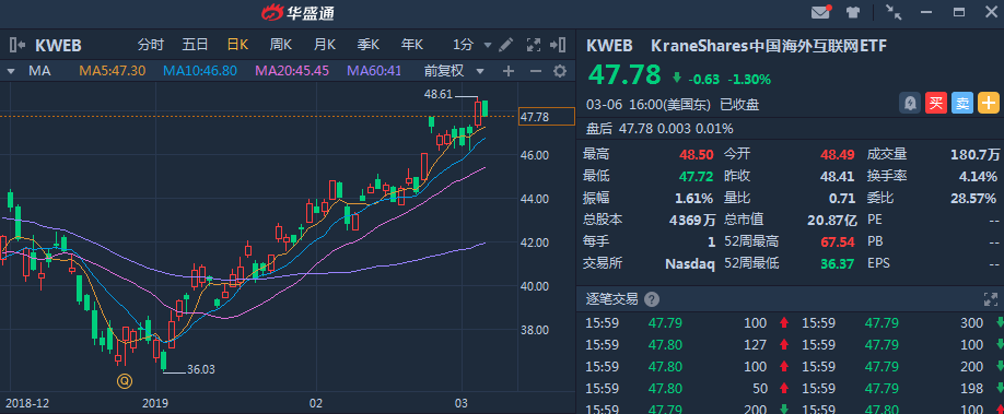 回顾一下这波反弹,首先,中美贸易磋商进入良好节奏,双方有达成一致预期、结束贸易战的共同愿望,这为反弹定下了基调,其次,国内经济逐渐稳定,而政府政策从“去杠杆”转向“稳杠杆”,社融数据大幅好转,A股应声大涨,年初以来涨幅超过20%,这波上涨对中概股的回暖也起到带动作用。实际上,追踪中概股的KWEB指数今年以来也经历了大幅反弹,如下图所示。A股和中概股开始反弹时间近乎发生在同一天,可见两者的强关联性。