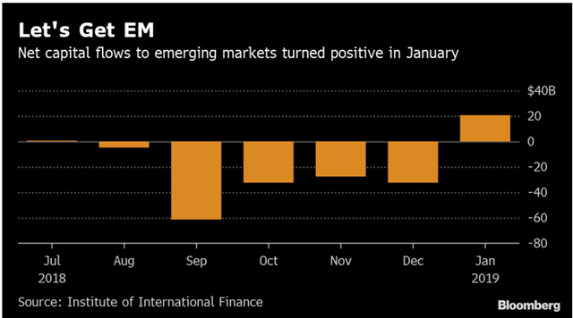 国际金融协会(IIF)数据显示,受各国央行逐步退出紧缩货币政策等因素影响,今年前两个月全球投资者已投入总计860亿美元购买新兴市场股票和债券,规模超过此前九个月(2018年4~12月)的总和,其中新兴市场2月资本净流入总额256亿美元,创近半年新高。