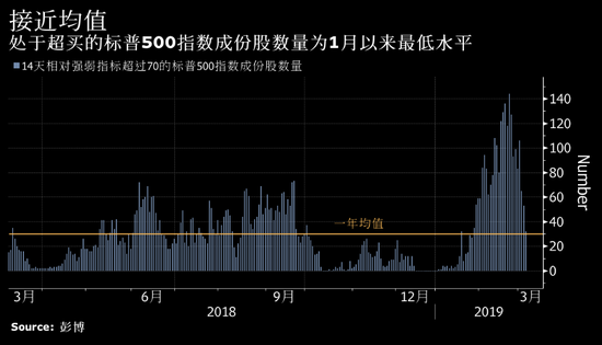 新浪美股讯 标普500指数3月份的下跌已使处于超买水平的股票数量回落至一年平均水平。截至周三,有32只股票的相对强弱指标超过70,是1月下旬以来的最低数量,仅比平均值30多出2只,表明随着投资者对全球经济的担忧加剧,股市的激动情绪已经降温。截至周三,继前两个月上涨超过11%之后,标普500指数3月份下跌了0.5%。