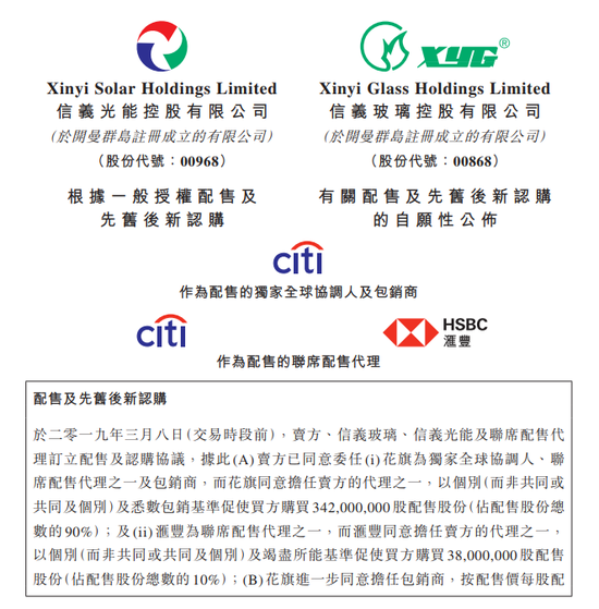 据此,卖方委任花旗为独家全球协调人、联席配售代理之一及包销商,以个别(而非共同或共同及个别)及悉数包销基准促使买方购买3.42亿股配售股份,占配售股份总数的90%;及汇丰为联席配售代理之一,以个别(而非共同或共同及个别)促使买方购买3800万股配售股份,占配售股份总数的10%。据悉, 配售股份即卖方实益拥有的3.8亿股现有信义光能股份。