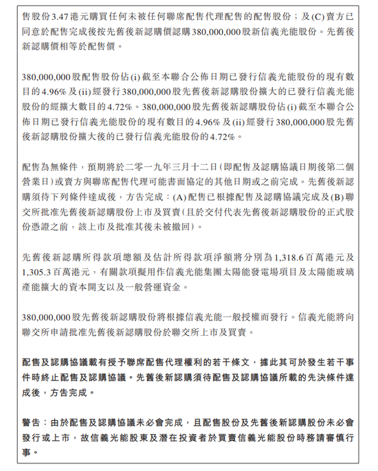 公告显示,先旧后新认购估计所得款项净额为13.05亿港元,有关款项拟用作信义光能集团太阳能发电场项目及太阳能玻璃产能扩大的资本开支以及一般营运资金。