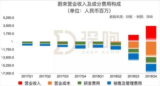 蔚来2018全实现全年营收49.5亿元,净亏损96.4亿元,净亏损额同比扩大92%。第四季度净亏损为35亿元,相比较上季度的亏损28.1亿,环比扩大25%。