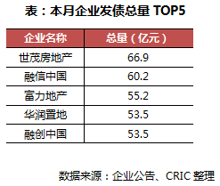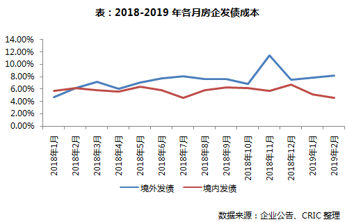 具体的融资方式来看,境外债发行量最大,占比为80.7%,达543.6亿元,环比下降27.4%,但是同比增加依然显著,达去年同期的3.5倍。主要由于2019年房企迎来还债高峰期,特别是境外债方面,多数企业高成本发债以“以旧换新”。