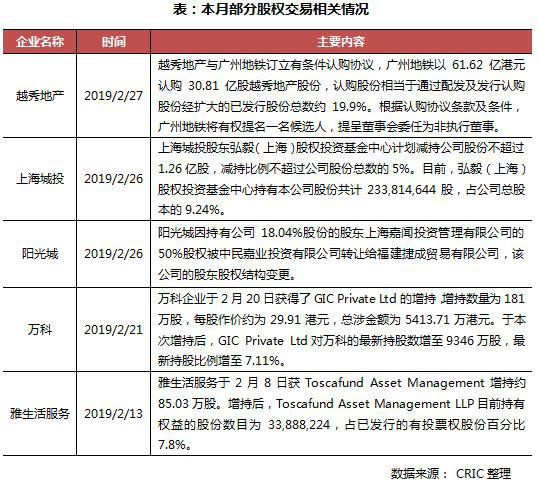 本月有多家房企进行了较大的股权变动,其中较为值得注意的是越秀地产引入了广州地铁作为新股东,股权比例为19.9%。作为此前合作密切的伙伴,本次越秀地产引入了广州地铁作为股东,可能意味着双方未来的合作将会更加频繁。由于广州地铁的发展空间极大,和广州地铁的合作预计将会为越秀地产的发展提供更多的机会。此外,上海城投、阳光城、万科等企业内部都有股权变动,同样值得注意。