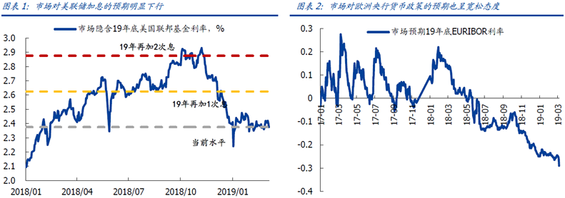 此后,全球放松预期持续升温,带动市场修复超预期。继12月议息会议对货币政策态度转鸽后,2019年初美欧央行轮番上阵,进一步推高市场对全球共同放松的预期。在美欧持续“推波助澜”下,市场预期朝着“全球货币政策放松”的路上一路狂奔,对于美欧2019年加息次数的预期快速下行。