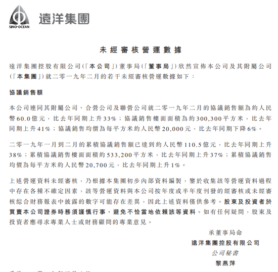 2019年1月到2月的累积协议销售额已达到约人民币110.5亿元,比去年同期上升38%;累积协议销售楼面面积约53.32万平方米,比去年同期上升37%;累积协议销售均价为每平方米约人民币2.07万 元,比去年同期上升1 %。