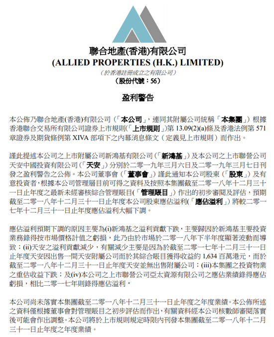应占溢利预期下调的原因主要为新鸿基的溢利贡献下跌,主要归因于新鸿基主要投资业务录得按市场价格计值之亏损,此乃由于市场于2018年下半年度显著波动而导致;天安溢利贡献减少,有关减少主要是因为于2017年度天安因出售一间天安附属公司而于其综合账目获得收益约16.34亿港元,而于2018年天安并无出售附属公司;(集团投资物业的重估收益下跌;及公司上市联营公司亚太资源有限公司应占业绩录得应占亏损,相比2017年则录得应占溢利。