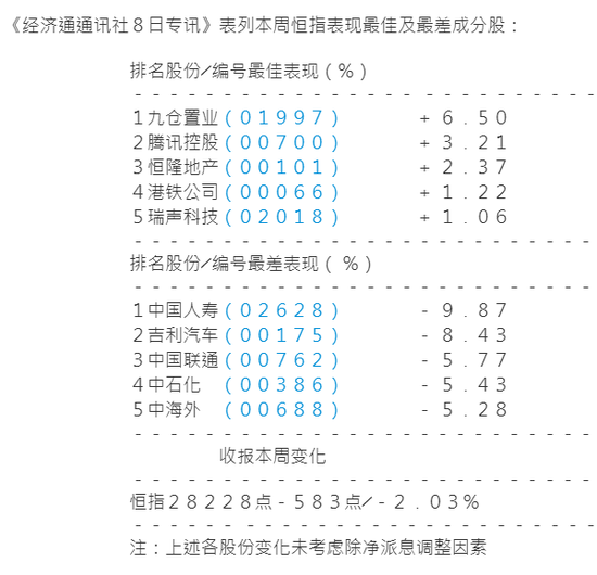 报告亦提到中央将持续推动网络提速降费,三大中资电讯商股价本周受压,下周三放榜的联通(00762),全周收报9﹒15元跌5﹒77%。中移动(00941)亦受影响,虽然获德银、汇证升目标价,全周仍跌3﹒16%收81﹒25元。中国电信(00728)周一董事长杨杰调任中移动,全周更跌6﹒65%报4﹒07元。中国铁塔(00788)去年纯利升36%符预期,获汇证、野村、大摩、瑞信看好,但全周回吐5﹒29%报1﹒79元。