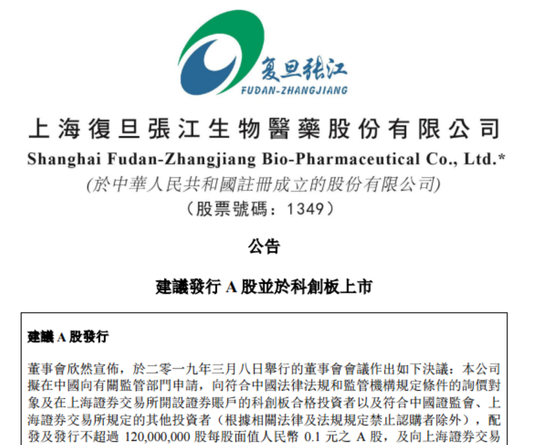 复旦张江(01349)发布公告,该公司拟在中国向有关监管部门申请,向符合中国法律法规和监管机构规定条件的询价对象及在上海证券交易所开设证券账户的科创板合格投资者以及符合中国证监会、上海证券交易所规定的其他投资者,发行不超过1.2亿股每股面值人民币0.1元的A股,及向上交所申请A股上市及买卖。