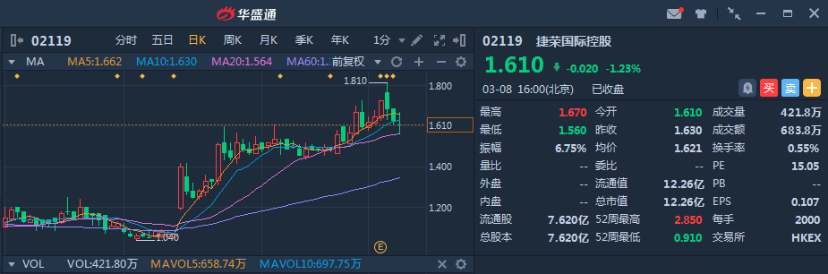 集团在内地东莞及香港设有近7万5千平方呎的生产基地。自家生产、加工烘焙及炒磨咖啡豆、拼配茶叶产品、生产即溶咖啡,茶及鸳鸯等饮品。为加强急冻肉类及急冻预製食品,分别跟 NH Food 订立合作协议和 F&N 订立谅解备忘录。籍此开发相关食品之策划、供应、分销及品牌宣传等机遇。可于现价1.61元附近买入,中长线可见2.40元,跌穿1.30元止蚀。