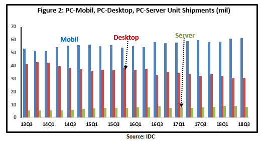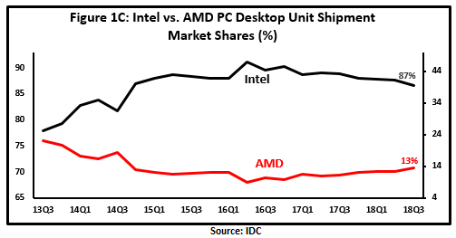 为了找到市场份额的衡量标准,我使用了英特尔和AMD的个人电脑总收入和总出货量(个人电脑台式机、个人电脑移动设备和个人电脑服务器)来展示AMD最近从Ryzen和EYPC的发布中获得的市场份额。在图1A中,AMD的电脑收入份额从2017年第三季度的4.7%上升到了2018年第三季度的5.8%。最近类似的增长可以在所有应用程序中验证(图1B -图1E)。显然,AMD在移动端、桌面端和服务器端用户的收入和出货量方面都取得了市场份额的增长。