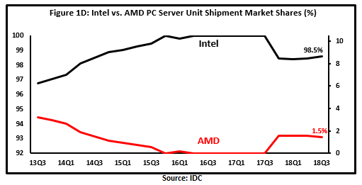 在最受关注和利润最高的服务器领域,AMD的市场份额最终打破了零,在2018年第三季度和第四季度分别上升到1.5%和3.2%(图1D)。到2019年,虽然英特尔仍然拥有更多的平台多样性,但AMD EPYC拥有更多的平台,可以占据高达个位数的市场份额。