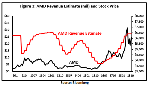 通过研究AMD收入增长、市场份额和股价之间的历史关系,可以很容易地观察到这两个相互竞争的点。从图3到图3B可以看出,AMD的股价变化与市场份额变化的关系明显大于与收入变化的关系。看来AMD的股价对市场份额的变化更为敏感。