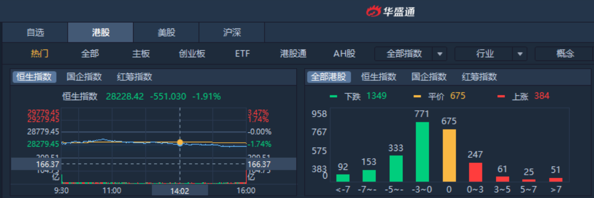 上周五恒指早盘低开1.29%,收盘跌551.03点,跌幅1.91%,报28228.42点,全日成交额1445.85亿。国企指数跌2.65%,报11156.82点,红筹指数跌2.16%,报4408.4点。