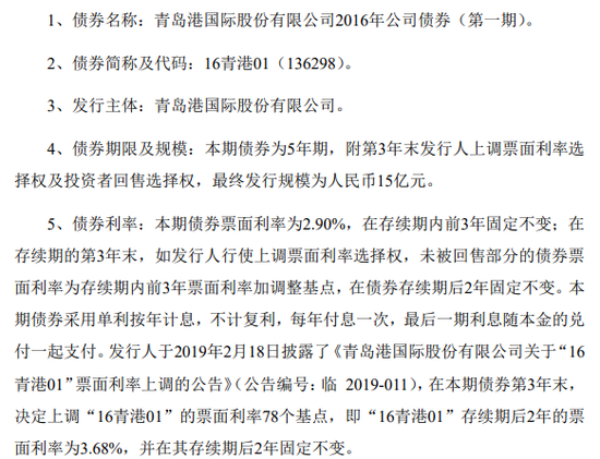 新浪港股讯 青岛港公布,公司将于2019年3月18日支付2016年公司债券(第一期)2018年3月18日至2019年3月17日期间的利息,债券简称“16青港01”,发行规模为人民币15亿元,票面利率为2.90%。每手“16青港01”(面值1000元)派发利息为人民币29.00元(含税)。