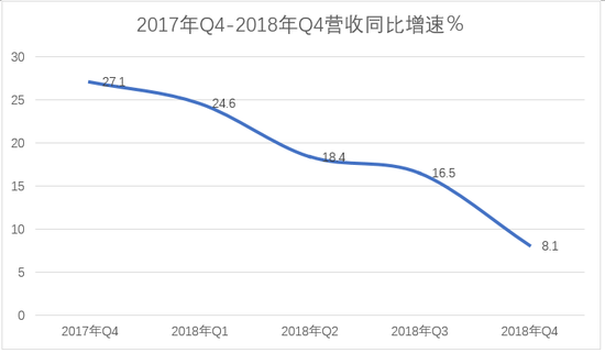 2018年Q4是唯品会营收首次出现个位数增长,此前的几个季度唯品会的营收增长都是双位数,比如2018年Q3同比增长16.46%、2018年Q2同比增长18.4%、2018年Q1同比增长24.6%。