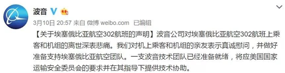 3月10日,波音公司官方微博发布两条声明:“波音已经获悉飞机事故的报道,并正在密切监控有关情况。”