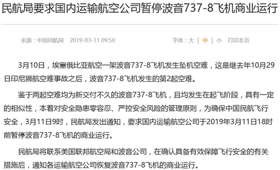 鉴于两次空难具有一定相似性,今天上午,中国民航局官网已经发布通告,要求国内运输航空公司暂停波音737-8飞机商业运行。