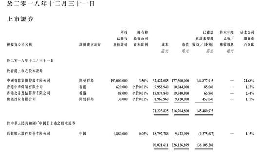据智通财经APP了解,在“禅易投资法”的指导下,中国鼎益丰作为一家从事投资业务的香港投资控股公司,投资港股上市公司中国智能集团(00395)、香港中华媒体(00003)、香港交易所(00388)、腾讯控股(00700),A股上市公司彩虹股份(600707.SH),投资总额为9791万港元,账面盈利1.28亿港元,投资收益率为130%。