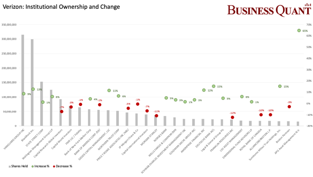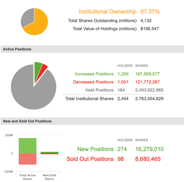 作为美国电信巨头,威瑞森(VZ)在市场中褒贬不一。不过,最新的机构季末持仓文件(13F)显示,公司股票遭机构大笔增持。如下图,本来机构云集的公司(占比高达67%)上一季度机构持仓大笔增加,新增仓位的274家,持股数量增长近1628万股,减仓机构的只有98家,股票出售只有868万股。