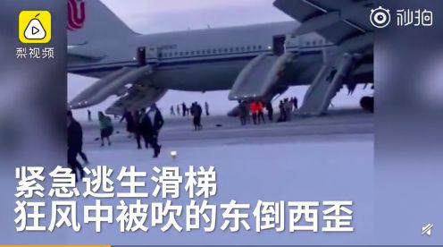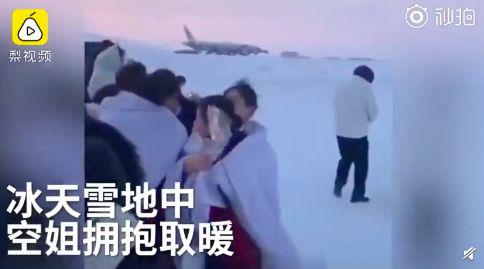 乘客和机组人员只能裹着小毯子在雪中瑟瑟发抖、等待救援。