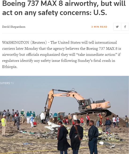赵小兰说,她星期一会见了美国联邦航空局代理局长埃尔韦尔,对埃塞俄比亚航空公司星期天的坠机事件和印尼10月的狮航坠机事件进行了评估,并询问“今后可能的方法是什么……我希望人们放心,我们非常严肃地对待这些事件和事故。”她还对记者说,美国监管机构正在“非常认真”地审查两架波音737 MAX 8飞机的致命坠毁事故。美国国家运输安全委员会和联邦航空局都在埃塞俄比亚。