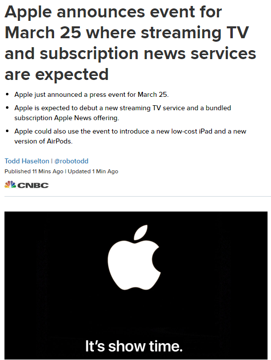苹果公司刚刚宣布将于太平洋时间3月25日上午10点在库比蒂诺史蒂夫乔布斯剧院举行新闻发布会。