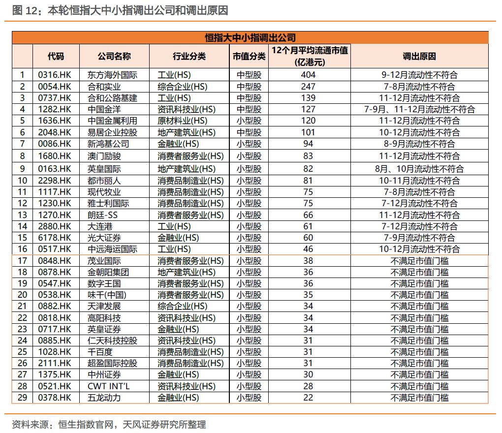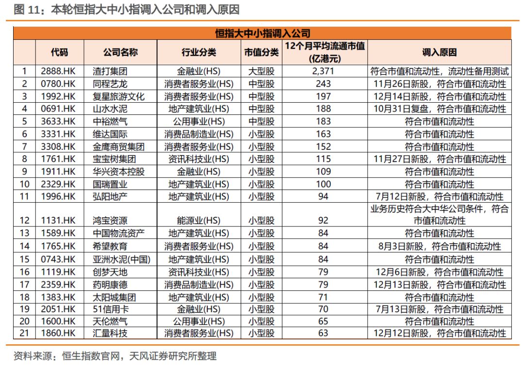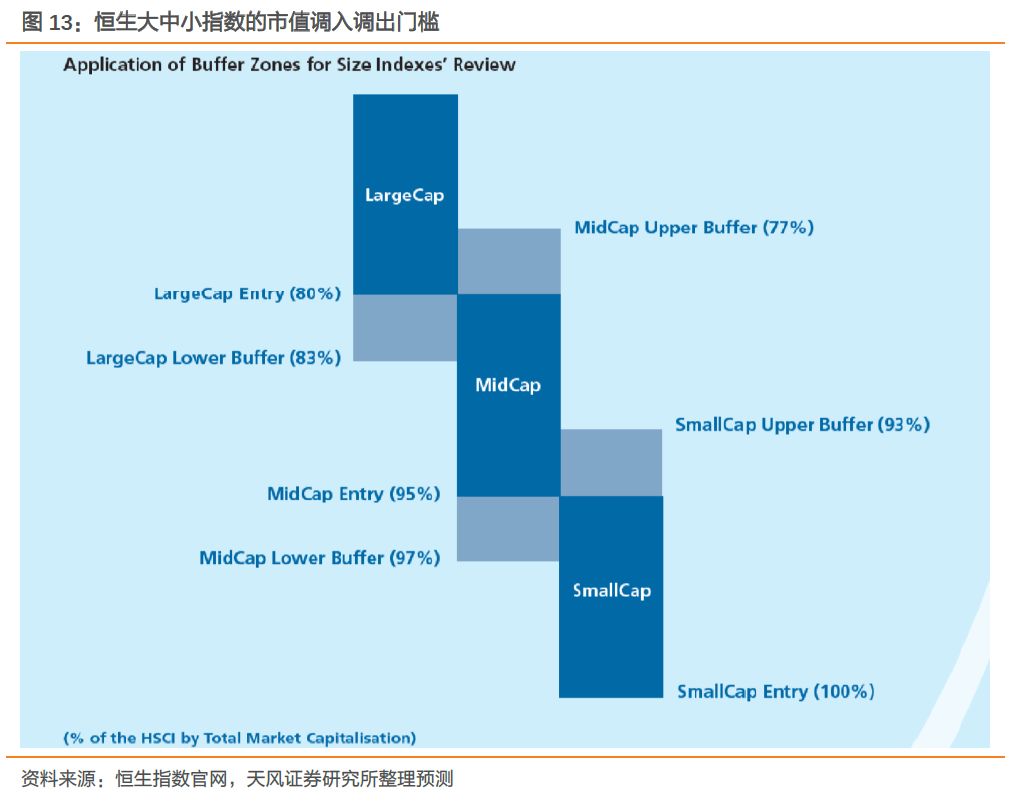 2)恒生中型指数:将新调整后的恒生综指所有公司12个月平均流通市值加总后,原来已在中型指数的标的,如果本次低于97%则被调出,如果在77%-80%则调入大型;如果在95%-97%中,则调为小型;原来不在恒生综指中的公司,如果市值在77%-93%之间则可进入中型指数;