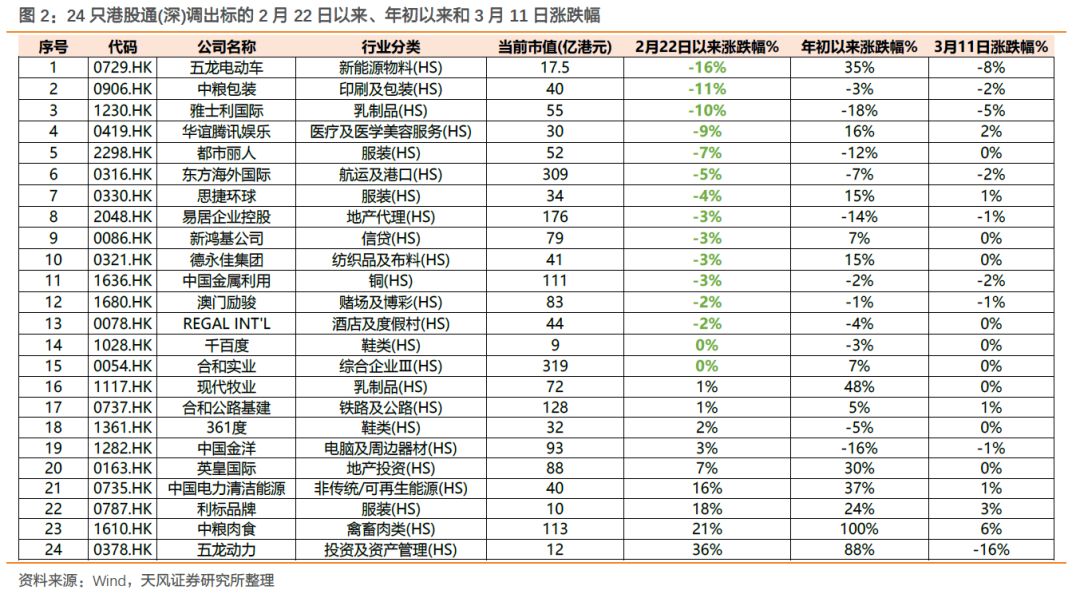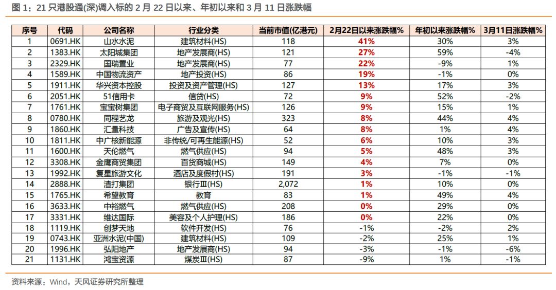 在2月22日恒生综指公布调整名单以来,21只调入标的中共有17只涨幅为正,其中太阳城集团自我们于2月12日发布报告预测调入港股通以来,累计涨幅逾50%。此外,山水水泥(+41%)、国瑞置业(+22%)和中国物流资产(+19%)等公司也涨幅靠前。与此相反,港股通标的调整后,被调出的股票且仍属于联交所上市股票的,则不得通过港股通买入,只可以卖出,因此我们也建议投资者防范踩踏卖出的风险。2月22日以来,24只被调出标的中共有15只调出标的存在跌幅,其中跌幅最多的五龙电动车跌幅达16%。