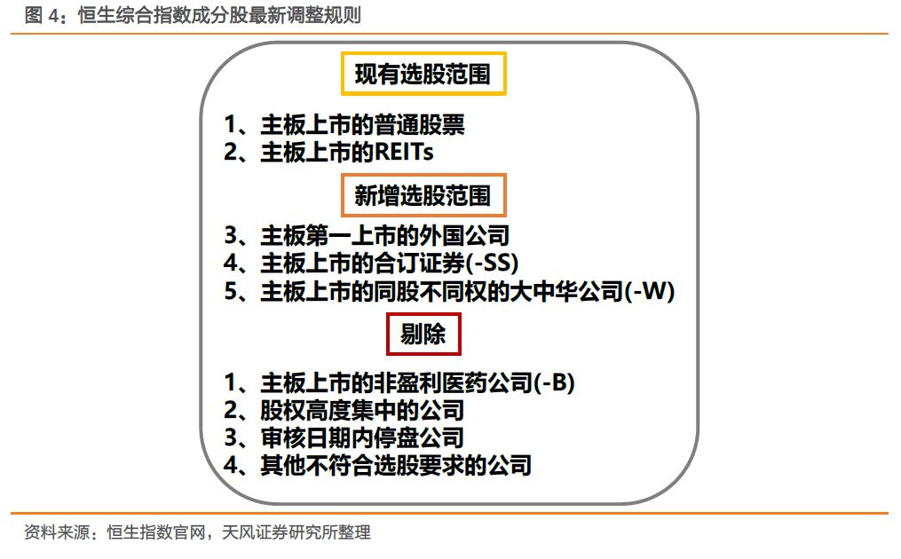 目前恒生综指有五大选股准则:1)主板上市的普通股票;2)主板上市的REITs;3)主板第一上市的外国公司;4)主板上市的合订证券(-SS);5)主板上市的同股不同权的大中华公司(-W)。