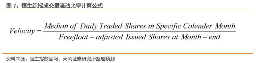 在筛选出满足选股标准的公司后,需满足12个月平均流通市值的标准,即:已在恒生综指当中的标的,如果12个月平均流通市值低于特定选股范围12个月平均流通市值之和的前96%,则被剔除恒生综指;不在恒生综指的标的,如果12个月平均流通市值高于特定选股范围12个月平均流通市值之和的前94%,则被纳入恒生综指。12个月平均流通市值计算方法为:每月月底的流通市值总和/12。如果一个标的上市时间小于12个月,则计算上市以来每月月底的流动市值平均。经测算,我们计算本次调入恒生综指的12个月平均流通市值门槛(即特定选股范围市值的前94%)约为62亿港元,而本次剔除恒生综指的12个月平均流通市值门槛(即特定选股范围市值96%之外)约为38亿港元。