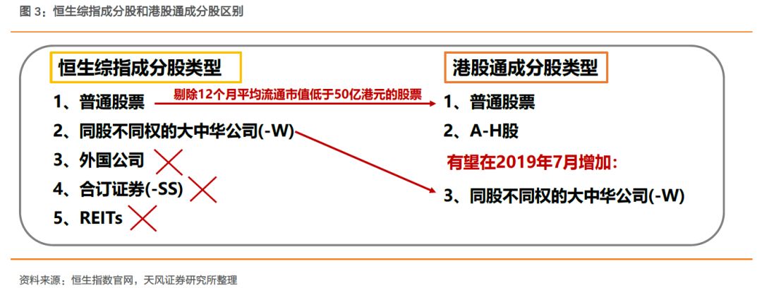 2018年5月恒指公司宣布在港股的第一上市外国公司、合订证券、同股不同权公司的股票都将进入恒生综合指数选股范畴,18Q3执行后纳入了如俄铝、普拉达、港灯-SS、小米和美团等公司。但值得注意的是,虽然纳入恒生综合指数,但这些股票暂不能进入港股通。18年7月内地沪深交易所公布:以内地投资者熟悉程度为由,暂不将恒生指数最近新增的三类证券(在港第一上市外国公司、合订证券、不同投票权架构公司)纳入港股通股票范围。加上港股通规定恒生综指中的REITs无法入选港股通,因此目前恒生综指中能够入选港股通的只有主板上市的普通股票,如金界控股、普拉达和俄铝等外国公司不能进入港股通。但在2019年2月28日港交所总裁李小加于记者会上透露,同股不同权公司(小米、美团)有望于19年7月纳入股票通。