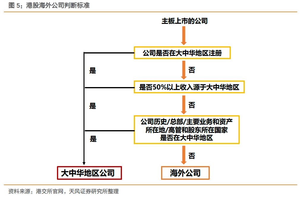 外国公司主要指注册地以及主要业务地点于大中华地区以外的公司,判定一家公司的业务是否以大中华为重心的考虑因素包括:1)公司在何地注册成立;2)公司的历史;3)公司的总部位于何地;4)公司的中央管理及控制所在地;5)公司的主要业务营运及资产所在地;6)公司主要管理人员及控股股东的国籍或居住国家。例如,金界控股(3918,HK)由于公司总部及主要业务在柬埔寨,因此为主板第一上市的外国公司,虽然在2018年10月被纳入到恒生综指中,但因外国公司无法进入港股通中。相反,太阳城集团(1383.HK)总部在香港,在澳门拥有太阳旅行社业务、同时在内地拥有物业资产,属于大中华地区公司,并在本次调整同时被纳入到恒生综指和港股通中。