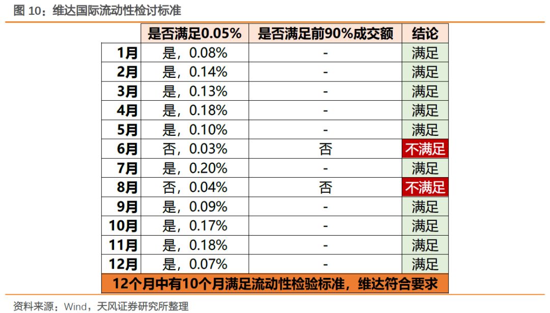 渣打和维达曾在2018年2月6日被剔除恒生综合指数,同时被剔除港股通,而本次又被重新调回恒生综指并纳入港股通,原因主要在于流动性重新符合恒生综指标准。经检测,渣打集团在2018年1月、2月、10月满足成交量比率达到0.05%以上的标准,但3月-9月和11月-12月不满足。我们采用备用标准后发现,渣打在3-9月和11-12月均位于市场前90%成交额排名以内,因此12个月均满足流动性检验标准。维达国际虽在2018年6月、8月不打到0.05%标准,也同时不满足备用标准,但整体符合10个月及以上达到流动性要求的标准。