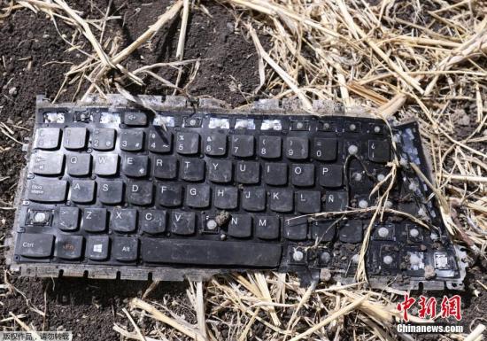 据埃塞俄比亚航空公司官网最新消息称,该公司失事的ET302客机的两个黑匣子:驾驶舱语音记录仪和飞行数据记录器均已寻获。当地时间3月10日上午,埃塞俄比亚航空公司一架波音737-MAX 8客机坠毁,机上157人全部遇难,中国大使馆证实其中8名死者为中国公民。图为坠机现场的电脑键盘残骸。