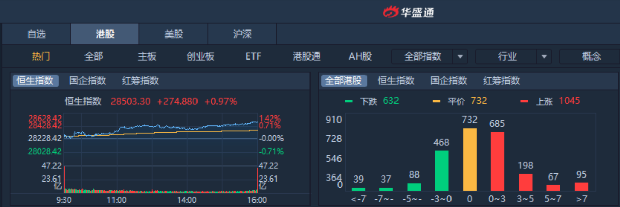 周一恒指早盘高开0.13%,最终收涨274.88点,涨幅0.97%,报28503.3点,全日成交额1027.89亿。国企指数跌1.08%,报11276.91点,红筹指数涨1.15%,报4458.88点。