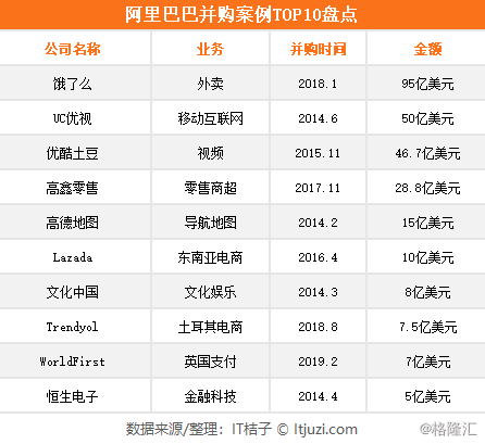 从 IT桔子、Crunchbase 的数据可以看到,GAT 三家在投资、并购领域,无论是数量、还是金额,都超过了绝大多数 VC、PE 的布局。我们今天从数据库中整理了 GAT 三家过去并购金额的 TOP10 案例,管中窥豹一般来看三家巨头的并购布局。