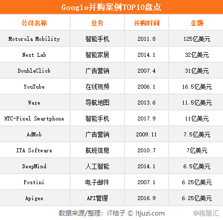 对 Google 而言,这些交易反映了 Google 的战略演变:广告技术(AdMob,DoubleClick)、技术储备(ITA Software,Postini)、海量信息 (Waze,Youtube)、移动互联网 (Motorola Mobility,Apigee,HTC-Pixel Smartphone)、AI 人工智能 (Nest,DeepMind)。