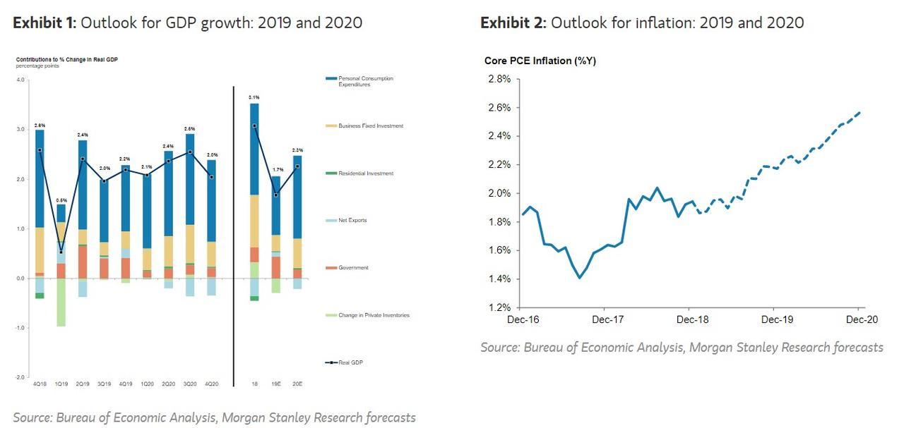 美国经济增长和通胀水平都有所放缓是美联储1月会议鸽派转向的原因。不过在摩根士丹利报告看来,美国经济将在今年一季度见底后有力反弹,通胀水平也将随之回升,使美联储在2019年底和2020年重启加息。
