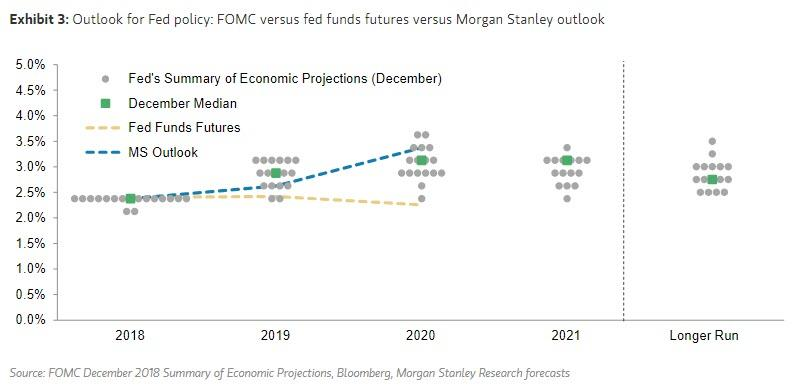 该报告进一步指出,通胀将持续到2020年,并于年中加速上行,这将使美联储在2020年初保持利率不变,并于明年6月、9月和12月分别再次加息。也就是说,按照大摩的预计,到2020年底,联邦基金利率将到达3.25%-3.5%区间。