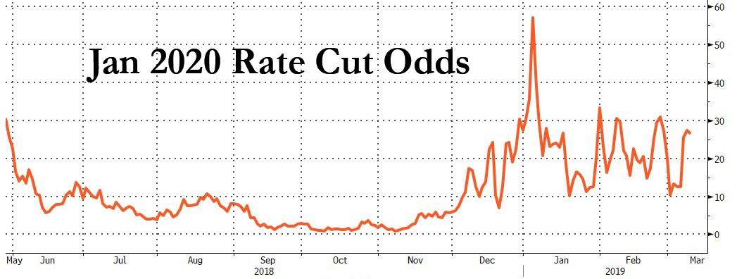在美联储最新一次会议意外转向后,市场对美联储鸽派预期已非常强烈,美国利率期货市场反映美联储2019年不会再有加息动作,在2020年1月降息概率为25%。
