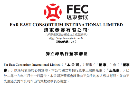 远东发展:独立非执行董事王敏刚3月11日辞世