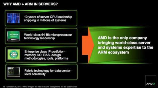 与AMD的芯片相比,ARM的价格仅低27%左右。考虑到AMD卓越性能的微小差异,我不认为它能够取代AMD。此外,AMD自2012年以来也一直在开发自己的基于ARM的芯片。下图来自AMD 2012年的投资者陈述: