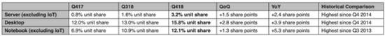 当AMD和Intel公布2018年全年业绩时,我们终于确认了AMD在市场份额上的显著提升。该公司在服务器、台式机和笔记本电脑的所有三个CPU领域都获得了份额。AMD在台式机市场份额增长2.8%,达到15.8%。看看服务器市场,AMD占据了3.2%的市场份额,同比增长2.4%。最后,在笔记本电脑市场,AMD获得了 12.1%的市场份额,其中增长5.3%。